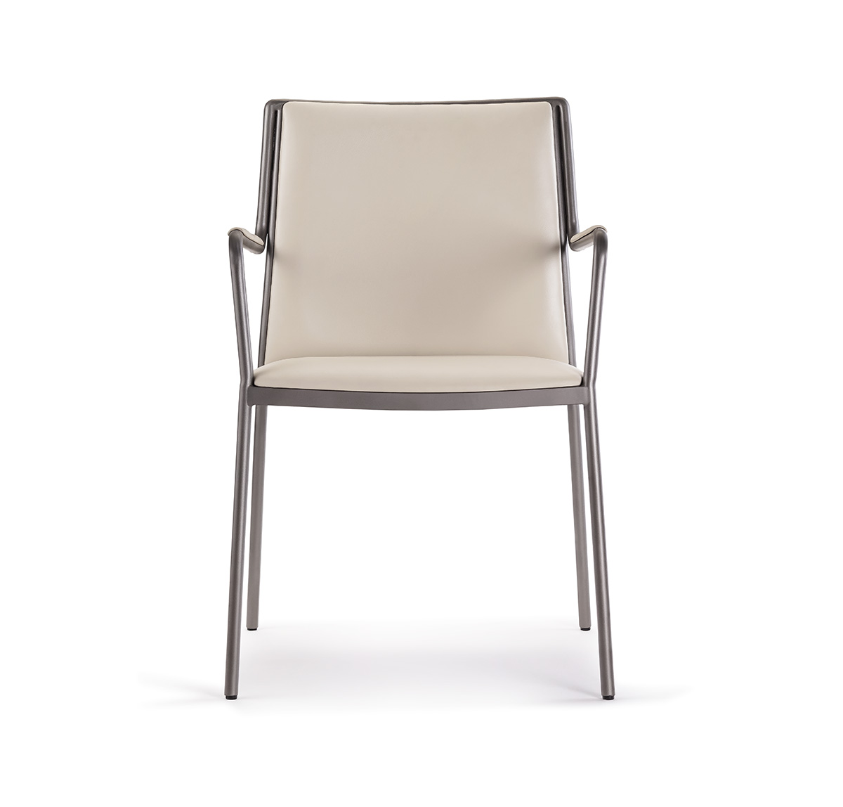Estrutura em aço carbono pintado. Assento, encosto e braço revestido conforme solicitação. Sapata nylon.