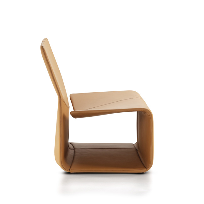 Poltrona em fibra de vidro com estofamento em espuma PU (Poliuretano) e revestimento tapeçado em couro natural ou ecológico.